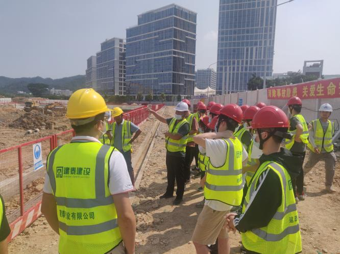 1号学院楼群由建泰建设公司承建,同学们在老师和现场工程师的带领下实地参观。在了解项目概况并接受相关安全教育后,同学们进入了实验楼群的基坑施工现场,实地了解基坑的施工细节。现场工程师对带队老师和同学们提出的关于基坑开挖与加固方法等方面的问题给予解答。带队老师也鼓励同学们要对比所学知识与工程实际的差异,积极思考和提出问题,运用专业知识解决问题。